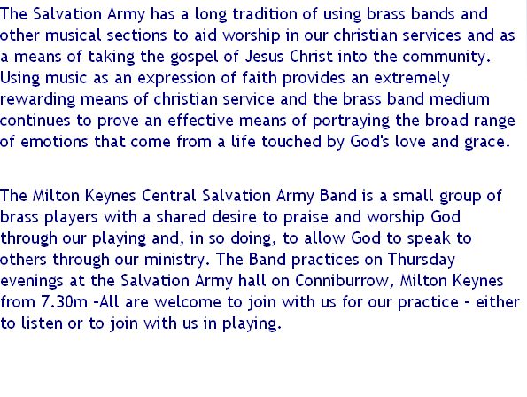 The Brigade takes part in the worship meetings on a Sunday, and also visits care and residential homes within the Milton Keynes area on a regular basis. The Christmas season is a particularly busy period in this respect.